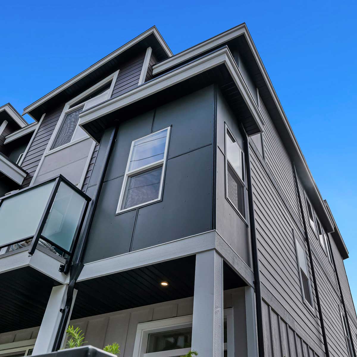 Fibre Cement Panel with Aluminum Reveals, Shingles, and Corrugated Metal Cladding